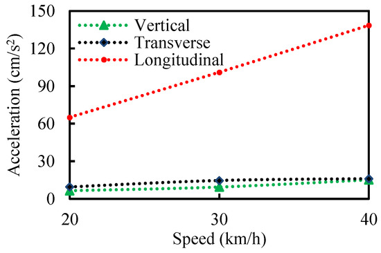 - The acceleration of the vehicles increases with the vehicle speed, not the number of vehicles. The transverse acceleration of the vehicle is significantly greater than the vertical one, and the transverse comfort is worse than the vertical comfort. The maximum transverse acceleration of the vehicle is 1.01cm/s2. The grade of the vehicle running stability is excellent.