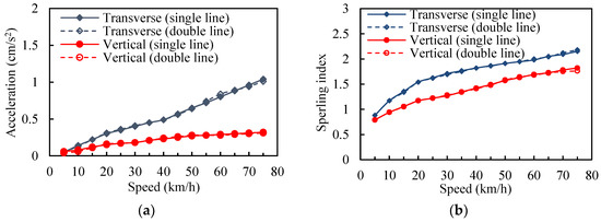 Figure 16 shows the simulation results of the acceleration and the Sperling index of monorail trains. It can be seen that there is almost no difference between the acceleration of one train running on a single line and the acceleration of two trains running on the double line. With the increase of the speed, the vibration acceleration and Sperling index of the train increase, but the riding comfort decreases. Furthermore, the transverse acceleration of the vehicle is significantly greater than the vertical one and the transverse comfort is worse than the vertical comfort. The data indicate that the running speed is the control index for the riding comfort evaluation, rather than the number of trains.