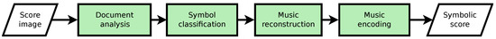 The traditional workflow for OMR comprises several stages [9], the first of which is the document analysis of the music score image (see Figure 1), followed by symbol classification, in which each meaningful symbol of the image is assigned a category. Music notation itself is reconstructed in the next stage, after which the music is encoded into the desired symbolic music format.
