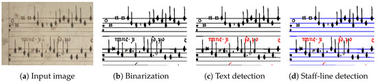 Another relevant step related to the document processing of music score images is the segmentation of text regions. This layer needs to be detected as well, since it usually contains relevant information, for instance, metadata or lyrics. Although the automatic recognition of this information is usually performed by Optical Character Recognition (OCR) systems, the document processing stage is in charge of detecting the corresponding regions. Few contributions have been made in this regard. Burgoyne et al. [30] proposed an approach for lyric extraction in early music manuscripts. The pipeline proposed in their work first binarizes the image, corrects the skew, and removes the staff lines. Then, lyrics are found on denser zones of the horizontal projections. Another strategy for music and text separation on music scores uses Hidden Markov Models (HMMs) [31], performing a concurrent detection and categorization of rows of the input image into either text or music notation.