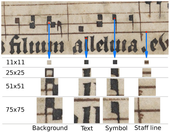 Although it was shown that the margin for improvement as regards to accuracy is rather limited, there are other issues on which this line of research can be extended. For instance, it has been observed that the approach of document processing presented in this paper involves a high computational time. Since OMR—especially for ancient manuscripts—is a process that is not necessarily intended to be performed in real time, this cost could be detrimental in an interactive scenario in which user and machines collaborate to solve the task together [45]. Therefore, a research path aiming at accelerating the processing of complete documents without losing classification quality is of interest. In this regard, our idea is to replace the current model, which performs an independent classification for each pixel of the image, by a model able to classify complete patches of the image.