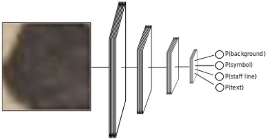 If the CNN has been properly trained to classify blocks into one of the considered categories, it can be used to perform the document processing of a music score image. To do so, each pixel of the image is queried, and its feature block is forwarded and processed by the network, as illustrated in Figure 4. As a result of this process, a probability is obtained for each category, and then we label that pixel according to the category that retrieves the highest probability.