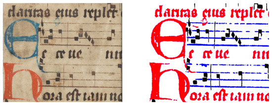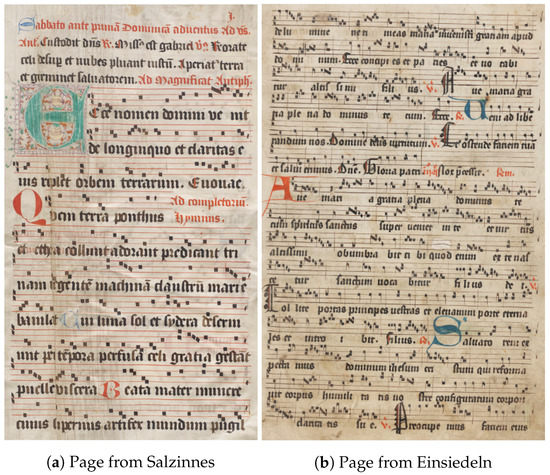 For the evaluation of the approach, we make use of high-resolution image scans from two different old music manuscripts. The first corpus is a subset of 10 pages of the Salzinnes Antiphonal (CDM-Hsmu 2149.14) (see https://cantus.simssa.ca/manuscript/133/), which is dated 1554–1555. The second corpus consists of 10 pages of the Einsiedeln, Stiftsbibliothek, Codex 611(89), from 1314 (see http://www.e-codices.unifr.ch/en/sbe/0611/). Example pages from these corpora are shown in Figure 6a,b, respectively. The image scans of these two manuscripts have zones with different lighting conditions, which may have affected the performance of the models that were evaluated. Einsiedeln manuscript scans, in particular, present areas with severe bleed-through that may mislead the learned model. The images were used with their original codification (RGB) with no pre-processing, given that CNN is designed to deal with the original data.