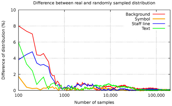 The idea is that we did not process documents entirely to compute the evaluation metrics, but a reduced subset of pixels. The number of samples to process, however, must be large enough so that the results can be considered reliable, especially in regard to the distribution of pixels per category (see Table 1). Consequently, we performed a preliminary study in which pixels of the documents were extracted randomly, and organized them according to the category to which they belong. In Figure 7, we show the difference between the distribution of pixels of each category that we found in this random subset and their actual distribution (y-axis), with respect to how many pixels were randomly extracted (x-axis). It can be observed that the curve stabilizes quickly, and so 100,000 random samples are enough to attain a difference between both distributions below in all categories. Therefore, the evaluation of the classification process considering a random subset of 100,000 pixels can be considered reliable enough for our experimental study.