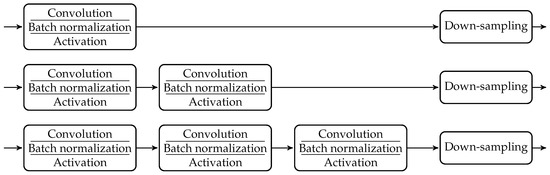 Example of convolutional layers, consisting of a different number of stacked convolution operators with batch normalization and ReLU activation, followed by a down-sampling operator.