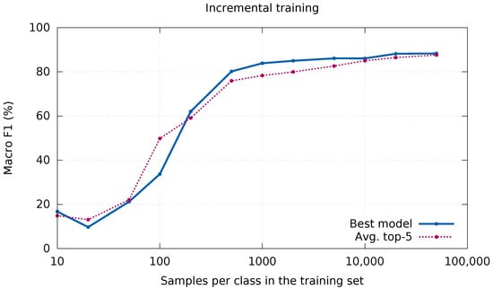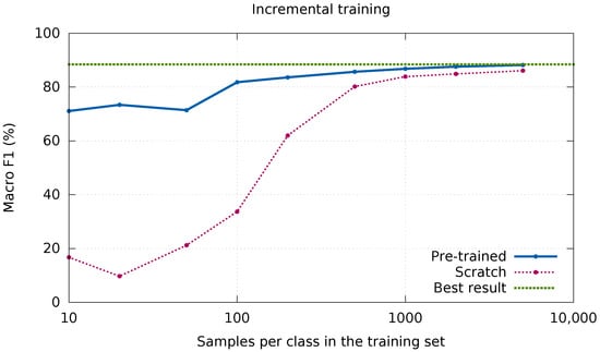 It can be seen that the CNN approaches the optimum much faster when it starts with prior knowledge. This comes as no surprise as we know that it already attained a fair result before providing it with new data. Furthermore, it is observed that modest improvements can be obtained by providing more than 1000 samples per class. In the case the network is pre-trained, it achieves results above 80% with only 100 samples of each class. In contrast, when training a network from scratch, that amount of samples leads to very poor results (less than 40% of F), and more than 500 samples of each class are needed to reach a similar performance.