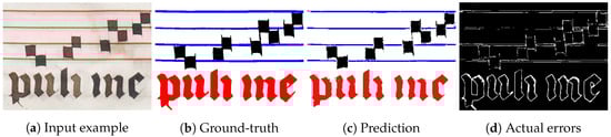 As regards the pseudo-metrics introduced above, it is obvious that these lead to significantly better results. That is to say, the hypothesis that many errors occur near the borders between symbols is verified; otherwise, the pseudo-metrics would not have increased noticeably. As an example of this phenomenon, Figure 10 shows a qualitative example from Salzinnes manuscripts. It depicts the difference between the CNN prediction and the human-labeled ground-truth data, highlighting the areas where there are discrepancies (see Figure 10d).