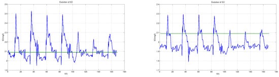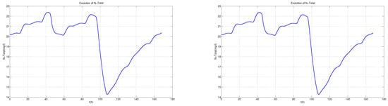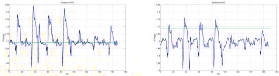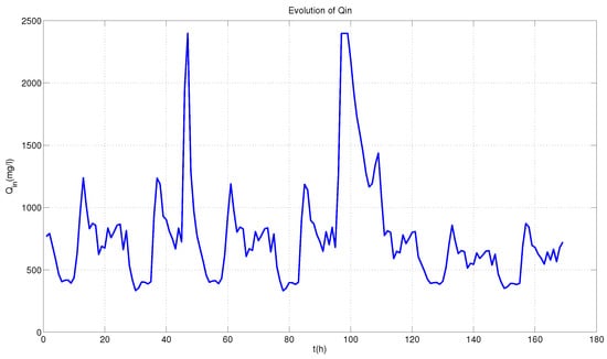 The performance of the plant strongly depends on the selected controller set points due to the plant nonlinearities. The set point selected for the performance evaluation correspond to the economically optimal steady state condition found considering the average values of the inputs in one operating period. The variable in the second tank is controlled at a set point and the variable in the first compartment is controlled at a set point of . The influent considered has been described in Figure 3, Figure 4 and Figure 5. The plant responses and the corresponding performance indices for 168 (One week) operating hours are compared.