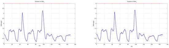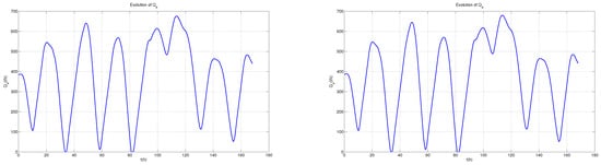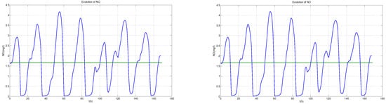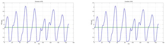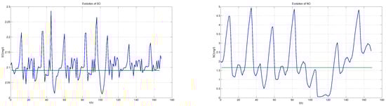 The controller performance evaluation includes the analysis of the temporal responses and the corresponding performance indices. The first comparison is presented in Figure 6, Figure 7, Figure 8 and Figure 9, where the NGPC (Case 1) is compared to the NEGPC (Case 2), for stormy weather disturbances. For both controllers, the set point tracking is particularly good for the , and the concentration satisfies the legal constraint (Table 4). The responses are very similar, and the only remarkable difference is that for tracking the NEGPC shows a small offset due to the incorporation of the economic term. The values (Table 6) are smaller for NEGPC as expected.