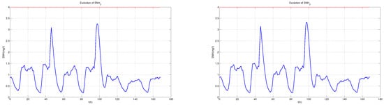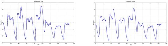 Secondly, in Figure 10, Figure 11, Figure 12, Figure 13, Figure 14, Figure 15 and Figure 16 a comparison of the proposed NECLGPC (Case 4) with a NCLGPC (case 3) is presented, also for stormy weather. The responses are again very similar, only showing a small decrease of the manipulated variables for the Case 4 controller, due to the inclusion of the economic term. This is also seen in the values of Table 6. For these controllers the tracking for improves achieving a better balance between and tracking. The two manipulated variables are shown in Figure 12 and Figure 13 which indicate that suitable control signals and drive the process to follow the set point, while satisfying the constraints (Equations (4)–(8)) imposed. The rest of constraints for the effluent (Table 4) are also satisfied (Figure 14), ensuring a proper quality of the effluent. Figure 15 and Figure 16 show the evolution of the parameters and , where can be seen larger variations in due to the larger variations in .