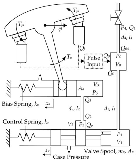 The control mechanism of the swash plate consists of the actuator part, the control valve part, the outlet chamber, the load, and the pipes (shown in Figure 2). The ripple flow input Q0 from the pumping pistons causes a pulsation pressure P0 in the outlet chamber V0. Most of the pressured oil flows to the load valve through a long pipe (with diameter d4, length l4), and the rest goes to the chamber V1 in front of the valve spool through a long, slim pipe (with diameter d1, length l1). The pressure P1 force acting on the valve spool against the spring force drives the valve spool to change the flow rate through the control valve. The oil flowing into or out of the actuator piston chamber V3 through a long slim pipe (with diameter d2, length l2) directly changes the chamber pressure P3, and hence the torque Ta on the swash plate.
