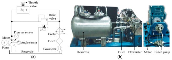 In order to evaluate the model of the swash plate of the piston pump, a test rig was built. The pump is driven by a variable-frequency motor, and its rotation speed can be varied from 0 to 8000 r/min. The specific parameter values used in this investigation are presented in Table 1.