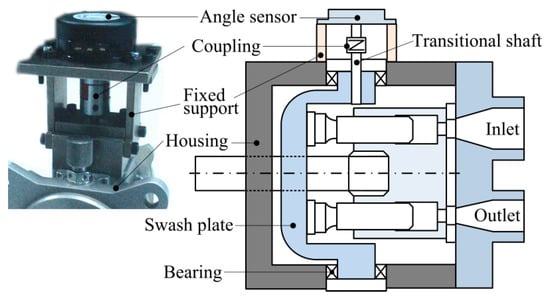 Figure 3 shows the test principle. The flow load of the test rig is controlled by a throttle valve and the pressure load is controlled by a relief valve. A high-frequency pressure transducer is located at the pump outlet to measure the pressure fluctuation, its accuracy is more than 0.1%. The measurement schematic diagram of the swash plate angle is presented in Figure 4. The oscillation of the swash plate is transmitted to an angle transducer through two shafts and a coupling. The angle transducer is a resistance precision potentiometer, and has a high resolution of 0.007°. The detail photos of the test rig are in the Supplementary Materials.