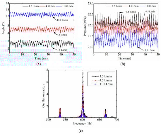 The experimental results at 4000 rpm are presented in Figure 5a,b. The peak-to-peak value of the swash plate oscillation are 0.9°, 0.7°, and 0.6° at the three load flow rates, 1.5 L/min, 4.5 L/min, and 11.0 L/min, respectively. The average swash plate angles of the three sets of results are 2.7°, 4.6°, and 12.3°, respectively. It can be observed, through the structure of the variable displacement mechanism, that a higher load flow rate leads to a larger average angle of the swash plate, which also leads to a smaller average volume of the actuator piston chamber. To evaluate the variable displacement mechanism dynamic response, the oscillation ratio is defined as the ratio of angle oscillation amplitude per pressure pulsation amplitude, as in Equation (34). The fast Fourier transform (FFT) results of the oscillation ratio at 4000 rpm are presented in Figure 5c for comparison with the simulation results. The ratios of the three sets of experiments are approximately 7.5, 5.5, and 4.0, respectively. The result can be interpreted as confirmation that the larger the volume of the actuator piston chamber is, the larger the resulting oscillation ratio of the variable displacement mechanism.