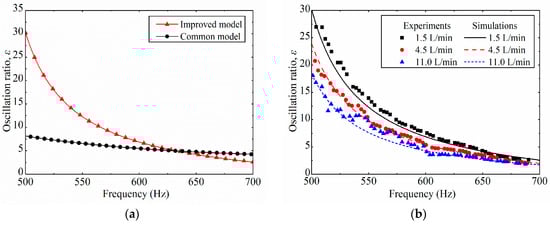 As the rated working speed range of this high-speed pump is from 3500 rpm to 4500 rpm, the simulation and experiments are carried out in the frequency interval from 500 Hz to 700 Hz, which is equivalent to 3340 rpm to 4670 rpm. Figure 6a shows the comparison of the improved model results and the common model results at the flow rate 1.5 L/min. The common model is based on previous research on the piston pump system [,,,,,,,]. There are significant differences between the two results. To further validate the accuracy of the improved model, the results of three sets of experiments and simulations are shown in Figure 6b. The load flow rates of the three sets are 1.5 L/min, 4.5 L/min, and 11.0 L/min, and the average volume of the actuator piston chamber of the three series of experiments is less than 5 × 10−7 m3. The results coincide with each other well, and demonstrate that the higher the load flow rate, the smaller the oscillation ratio, which is also consistent with the following simulation results, as shown in Figure 7b. Furthermore, the oscillation ratio decreases rapidly with the increasing rotation speed, which means that the improved model results have far more similarities with the experimental results than the common model results.