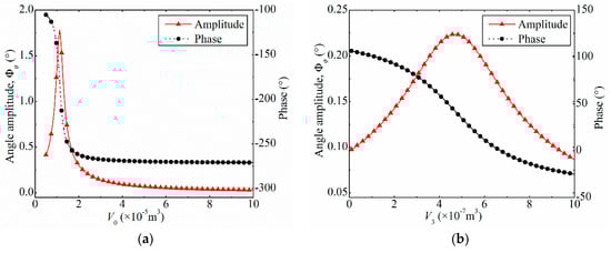 There are two oil chambers, as shown in Figure 2: the outlet chamber (V0) and the actuator piston chamber (V3). In Figure 7a,b, the amplitude and phase of the swash plate oscillation change dramatically with the volume of the outlet chamber and the actuator piston chamber. Conversely, the chambers before or behind the valve spool (V1 and V2) have little influence on oscillation, because of the narrow intervals of the changing volumes. When V0 is near 6 × 10−6 m3 or V3 is near 5 × 10−7 m3, the amplitude of the oscillation reaches the maximum, and the phase drops remarkably; approximately 170 degrees and 130 degrees, respectively.