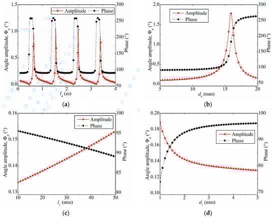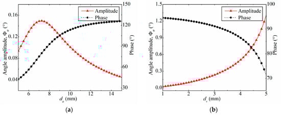 The action area of the actuator piston can dramatically affect the oscillation. There is a resonance point when the diameter of the actuator piston is near 7 mm in Figure 10a. Unlike the chambers in Figure 7, the phase of the swash plate oscillation increases rapidly near the resonance point. As shown in Figure 10b, the amplitude increases to about 1.3 in the changing range 1–5 mm.