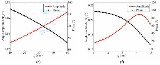 In addition to the load pipe, there are two long, slim pipes in the variable displacement mechanism affecting the oscillation of the swash plate. There are severe resonance points when the pipe’s length increases in Figure 8a, which coincide with the pressure response of a typical pipe. Hence, resonance points of the swash plate oscillation are due to the length of the pipe when it equals the integral multiples of the pressure wavelength in the pipe. Increasing the load pipe diameter can significantly increase the amplitude of the oscillation, as shown in Figure 8b. The oscillation reaches its maximum at a diameter of 16 mm. Once the diameter of the load pipe exceeds 16 mm, the larger the diameter, the lower the oscillation amplitude. This is because the large diameter of the pipe can be considered as additional volume of the outlet chamber. The amplitude increases as the length of the pipe increases before the control valve in Figure 8c, and similar trends can be observed in Figure 8e. The changing amplitude range of the pipe behind the control valve is about 0.04, which is almost twice as large as the pipe before the control valve. The diameters of the two pipes have an almost converse influence on each other. The large diameter of the pipe before the control valve shows stronger capacitive characteristics than an additional volume of the outlet chamber. Meanwhile, the influence of the pipe diameter behind the control valve and the volume V3 of the actuator piston chamber show similar performance.