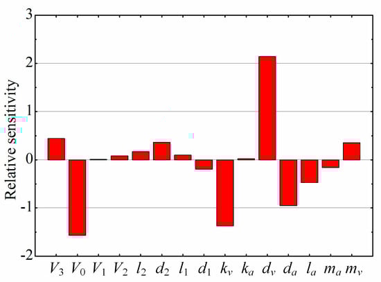 In order to characterize the influence of every structural parameter on the oscillation of the swash plate, the local relative sensitivity, based on the differential method, is given in Figure 11. We can see that the volume V0 of the outlet chamber, the stiffness kv of the control valve spring, the action area of the actuator piston, and offset distance la of the actuator piston are the four key parameters that have a large effect on the swash plate dynamic response. Reducing the values of the four parameters results in a significant increase in the amplitude of the swash plate oscillation and may even cause resonance. Hence, these four values need to be further increased to the appropriate sizes. On the other hand, the diameter dv of the control valve spool and the dead volume V3 of the actuator piston chamber also have a large effect on the swash plate dynamic response. A reasonable decrease in the values of the two parameters can further reduce the oscillation amplitude of the swash plate.