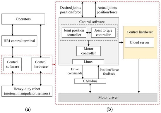 Figure 1b shows the control system of heavy-duty robot, mainly including control software and control hardware. The control system runs in a Linux environment and uses a ROS operation platform. The heavy-duty robot uses a hierarchical control system of the real-time kernel, which puts data processing on the cloud with the advantage of recording the operation logs conveniently and improving the effectiveness of the control system. The controller area network (CAN) bus adopts a ring-shaped redundant topology to realize the system’s multi-loop control. Based on the kinematics and inverse dynamics of the joint position controller and the joint torque controller, the control system can obtain the information about the desired joint angle, position and torque of each joint according to the commands, which make up of desired terminal joint position and trajectory from HRI control terminal. The motor controller converts the calculated desired angle, position, and torque of each joint into a corresponding motor drive command, which is transmitted from the control system via the CAN-bus to the motor driver. Subsequently, the motor driver adjusts the motor’s torque and rotation speed to drive the manipulator. In this process, the cloud server is responsible for the realization of software algorithms and data calculation. Finally, the information of force and position is fed back to the operator through the HRI terminal, and then the HRI terminal is waiting for the next operation commands.
