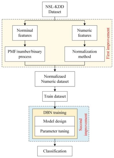 Figure 2 shows the DBN improvement process based on the NSL-KDD dataset. The NSL-KDD dataset that provided by the Canadian institute for cybersecurity is used as the intrusion detection dataset. In this paper, the 41 dimensional data characteristics are divided into the nominal type and the numeric type (Table A1). The probability mass function (PMF) encoding of the nominal type and the normalization processing of the numeric type are carried out, respectively.