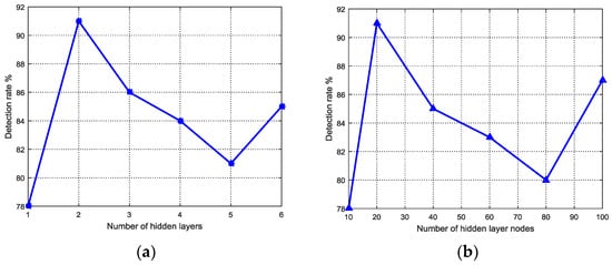 As shown in Figure 3a, the model obtains a relatively high detection rate in the detection process when the number of hidden layers is 2. In addition, increasing the depth of DBN is not a positive correlation with the ability of feature extraction. Instead, it may lead to the decrease of generalization ability and the problem of overfitting.