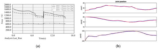 In order to test the correctness and accuracy of the manipulator dynamic model, the dynamic simulation experiment was performed by defining the rotation drive and torque of the seven joints. The simulation adopted the basic mode and the simulation type selected default. Moreover, the simulation time was 16 s. In this simulation, we added the same drive function to joint 5 and joint 6. The force of each joint in heavy-duty manipulator could be obtained through the Adams post-processing module. As shown in Figure 6a, the forces of the three joints at the end of the manipulator is given. And the force curves of joint 5 and joint 6 are similar, which is consistent with our drive equations, demonstrating the correctness of the dynamic model. In addition, Figure 6b shows the follow-up of dynamic model’s trajectory of the first three joints and the actual joint trajectory for the same control input based on a heavy-duty robot, where the blue line represents the manipulator and the red line represents the dynamic model. It can be seen from the figure that the established model and the actual trajectory are mostly consistent, ignoring the leading or lagging in some places, which proves the accuracy of the established model.