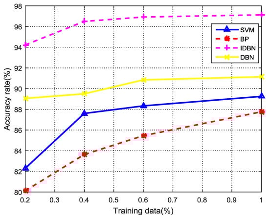 In the condition where the number of hidden layers is fixed at 2 and the number of nodes in each hidden layer is changing, the change trend of the correct detection rate is shown in Figure 3b. When the number of nodes is 10, it is not enough to extract the feature set, which is suitable for classification, because of the less connected nodes to each other. Meanwhile, when the number of nodes is too large, there will be a problem of overfitting. Therefore, the correct detection rate is relatively highest when the number of hidden layer nodes is set to 20. Then, the design of IDBN is completed.
