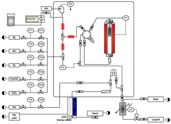 The automated reaction equipment used (PID Eng. and Tech. Microactivity) (Figure 1) is illustrated elsewhere [35]. It is provided with a high-pressure isothermal 316 stainless steel reactor, with an internal diameter of 9 mm and 10 cm of effective length. The reactor is located inside a ceramic chamber, heated by an electric resistance, and can operate up to 100 atm, 700 °C, and 5 g of catalyst. The catalyst is mixed with an inert solid (carborundum with 0.035 mm average particle size), to attain a sufficient bed height under low space time conditions, as well as to ensure the isothermality of the fixed-bed.