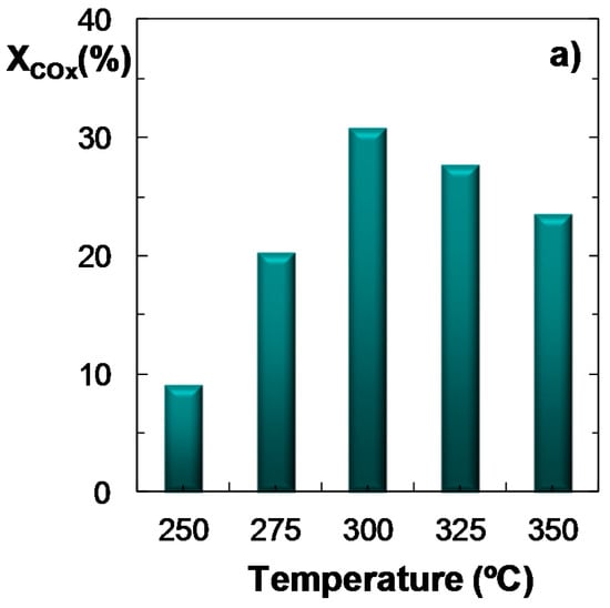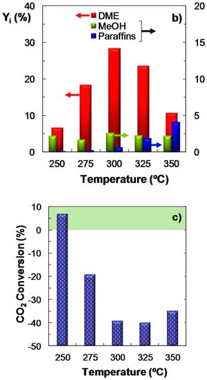 When CO2 utilization is analyzed in Figure 2c, it is necessary to distinguish two regions: (i) the area where the net CO2 conversion is negative, that is, where there is formation of CO2, due to the predominant role of the reverse WGS reaction (reverse Equation (3)). In this case, the value will correspond (in absolute terms) to CO2 yield; and (ii) the area of positive CO2 conversion. In general, the effect of temperature over CO2 conversion shows the opposite trend to that of DME yield (Figure 2b). The results plotted in Figure 2c show a positive value of CO2 conversion at 250 °C (7.5%), while above this temperature there is a net formation of CO2, with a maximum at 325 °C. Regarding the study of the capability of the process for the utilization of CO2, it should be noted that temperatures below 250 °C have not been studied, as under these reaction conditions both COx conversion and DME yield are very low. On the other hand, it was observed that for CO2/CO ratios above 1/3 (results not shown) the effect of temperature on CO2 conversion is attenuated: (i) at 250 °C, the conversion of CO2 is similar to that obtained with a CO2/CO molar ratio of 1/3; (ii) at 275 °C, the CO2 conversion value is low; (iii) at 300 °C, the net CO2 formation is lower than that of CO2/CO = 1/3. It must also be noted, that the results correspond to per-pass conversion values. This conversion can therefore be increased operating on a larger scale, by recycling the (CO + CO2 + H2) gas stream, which are easily separated from the products (DME, methanol and water) by condensation. Note that this limitation of the per-pass conversion by thermodynamics is greater in the reaction of CO2 hydrogenation to methanol, which therefore, also requires the recycling of the unconverted reactant gases to improve the economics of the process [37].