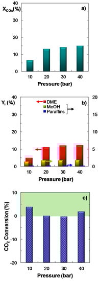 Figure 3 shows the influence of pressure (between 10–40 bar) on the reaction indices. The remaining operating conditions have been fixed as follows: Feed, ternary mixtures of H2 + CO + CO2 with CO2/CO molar ratios between 1/3 and 1; temperature, 275 °C; space time, 10 gcat h (molC)−1; H2/COx molar ratio, 3. The results indicate that COx conversion increases with pressure (Figure 3a), which is characteristic of the DME synthesis reaction, given that it involves a reduction in mole number. It is observed that, for the CO2/CO molar ratio used in the feed (2/3), an increase in pressure from 20 to 40 bar results in a very low improvement of the reaction indices. Hence, DME yield rises from 11.0% to 12.3% (Figure 3b). Moreover, under the operating conditions studied, the conversion of CO2 is positive (Figure 3c) in the whole pressure range, with a minimum within the 20–30 bar range. Nevertheless, it should be noted that for a CO2/CO ratio lower than that plotted in Figure 3 (that is, for CO2/CO molar ratios of 1/3), the effect of pressure on the reaction indices is more pronounced (results not shown). In consequence, it can be concluded that an increase in the CO2 content in the feed attenuates the favorable influence of pressure on the reaction indices.