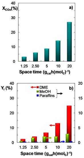 The effect of space time (in the 1.25–20 gcat h (molC)−1 range) on COx conversion, product yield and CO2 conversion has been studied under the following reaction conditions: Feed, ternary mixtures of H2 + CO + CO2 with CO2/CO molar ratios between 1/3 and 1; temperature, 275 °C; pressure, 30 bar; H2/COx molar ratio, 3. Results in Figure 4 show the influence of space time on the reaction indices for a ternary feed with a CO2/CO molar ratio of 2/3, as an example of the data obtained for the different feeds studied. It is observed that an increase in space time has a favorable effect on COx conversion (Figure 4a) and DME yield (Figure 4b). It should be highlighted that at these conditions CO2 conversion is positive within almost the entire range of space time studied (Figure 3c), with a maximum value (10%) at 2.5 gcat h (molC)−1.