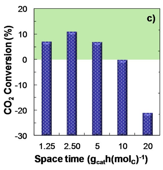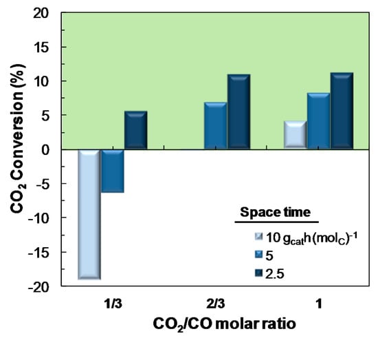 When analyzing the effect of CO2/CO molar ratio on the conversion of CO2 for different values of space time (within the 2.5 and 10 gcat h (molC)−1 range), (Figure 7), it is observed that the importance of the favorable effect of decreasing space time on the conversion of CO2 depends on the CO2/CO ratio in the feed. Indeed, for low values of this ratio (1/3), the conversion of CO2 is significantly favored using low space time values. Nevertheless, this effect decreases when increasing CO2/CO ratio, that is, under operating conditions of higher CO2 conversion.