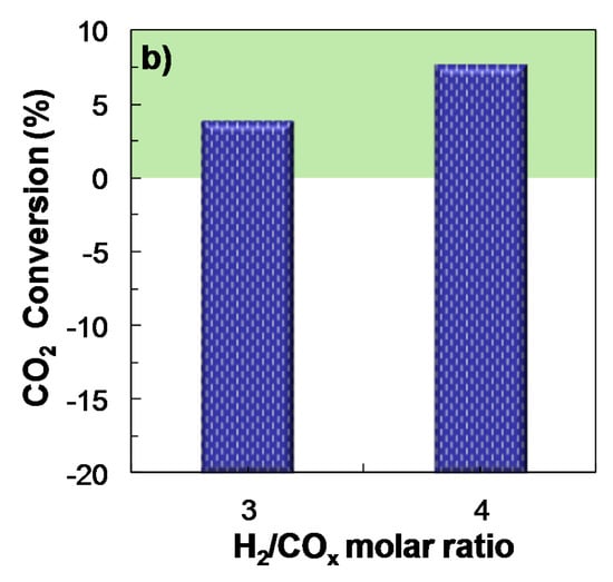 The results of COx conversion, DME yield and selectivity in Figure 5a (corresponding to feeds with a CO2/CO molar ratio of 1, taken as an example) point out that the improvement in these reaction indices when increasing H2 concentration in the feed from H2/COx = 3 to 4 is negligible. The same behavior was observed for the rest of the feeds studied (CO2/CO molar ratios of 1/3 and 2/3). However, the increase of H2/COx ratio above 3 is effective for increasing CO2 conversion (Figure 5b), since the transformation of CO2 to CO through the reverse WGS reaction (reverse Equation (3)), is favored.