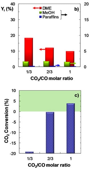 Figure 6 displays the effect of CO2/CO molar ratio in the feed (between 1/3 and 1) on COx conversion (Figure 6a), product yield (Figure 6b) and CO2 conversion (Figure 6c). The other operating conditions are: feed, ternary mixtures of H2 + CO + CO2 with H2/COx molar ratio of 3; temperature, 275 °C; pressure, 30 bar; space time, 10 gcat h (molC)−1. The results are consistent with those reported in the previous sections and reinforce the fact that an increase in the concentration of CO2 in the feed leads to a decrease in COx conversion and in DME yield, in good agreement with the results reported in the literature [25]. The upgrade of CO2 conversion with increasing CO2/CO ratio is also confirmed in Figure 6c.