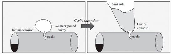 As an urban area grows, buried pipeline systems are required to supply water and provide drainage for the city. These pipeline systems cannot avoid ageing, and thus, cracks can occur in the sewage pipes. Kuwano et al. [] showed that pipes that are more than 25 years old have a significant increase in defects. For the efficient use of urban space, subway tunnels, basements of high-rise buildings, and water supply sewer pipes are constructed and buried underground. Due to improper construction management, insufficient management of these facilities, or exceedance of the lifetime, these underground structures can disturb adjacent ground. When this disturbance initiates and propagates to the surface, the surface may settle downwards or suddenly sink due to internal erosion, as shown in Figure 1 [,]. Sinkhole incidents affect infrastructure and property, and in some cases, can endanger lives. Several techniques have been employed to prevent such incidents, including underground cavity detection using ground penetrating radar (GPR). Although GPR is a fast and non-destructive method, difficulties remain in detecting smaller cavities [,]. Indiketiya et al. [] conducted tests simulating cyclic sewer pipe defects with particle image velocimetry (PIV) tracking and found that void formations occurred above pipe openings, followed by a settlement of the soil surface.