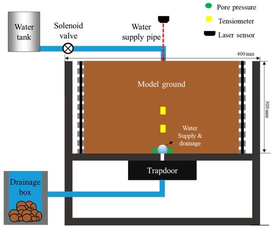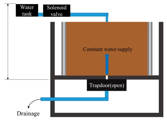 This aim of this research is to investigate the effect of repetitive cycles of water leakage and drainage within sewer pipes on ground subsidence mechanisms. The model box used in the tests is shown in Figure 2. The model box can contain a model size of 400 mm × 300 mm × 140 mm. Water was supplied from an outside water tank, in which the water level remained constant to ensure a constant pressure head for the supplied water. A water supply pipe from the water tank was connected to a solenoid valve that precisely controlled the water supply via computer. This water supply pipe was then buried through the soil along the back wall of the model box through to the bottom of the model ground to supply the water right above the opening located at the bottom center of the model ground. A 5-mm-wide opening was located at the bottom center of the model ground, and a trapdoor was located further below to simulate a crack in the pipe. The water supply pipe was connected to the trapdoor to collect and transport leaked outflow. This test setup is shown in Figure 3.