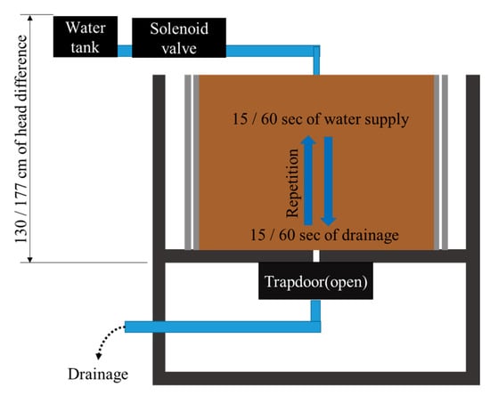 Five test cases with two different pressure heads and three different water supply cycles were performed. Pressure heads of 130 cm and 177 cm were chosen to investigate water head influence. For the water supply test, there were three different methods. First, a continuous water supply was applied until the propagation of the cavity to the surface. Second, a succession of supply/drainage cycles was applied to the specimen until collapse. Each supply and each drainage cycle lasted 15 s, after which the same succession of supply and drainage cycles was applied for 60 s. Figure 4 and Figure 5 show a schematic of the water supply modes. The purpose of these experiments was to investigate ground subsidence induced by sewer pipe leakage. Continuous water supply was used to simulate the occurrence of a crack in a sewer pipe, while cyclic water supply simulated the cycles of flooding and drainage during rainy periods.