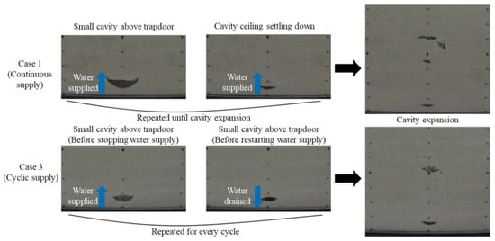 In Table 2, test cases are summarized. Cavity formation cycles for the continuous water supply cases and cyclic water supply cases both had similar and different behaviors. For both water supply methods, cavity formation and closing was observed. The cavities formed and closed directly above the water opening at the early stages of the experiments. This process of cavity formation and closing continued during the experiments, increasing in size. As the cavity size increased, it led to a collapse of its ceiling and the formation of a cavity above the previous one in the middle of the soil specimen (Figure 6). This mechanism was pursued until the collapse of the upper layer of the soil specimen. The difference between the water supplies triggered the cavity contraction. For the continuous water supply case, the cavity expansion and contraction cycle continued with a continuous water supply from the bottom, and did not follow any particular trend. Meanwhile, for the cyclic water supply case, cavity contraction occurred when the water was drained, while the cavity expanded when the water was supplied. Thus, each cycle corresponded to a cavity formation and contraction.