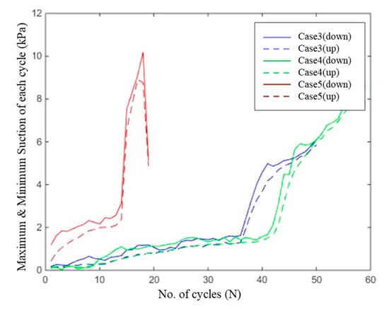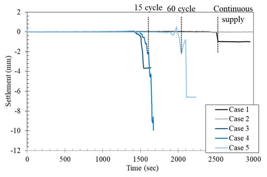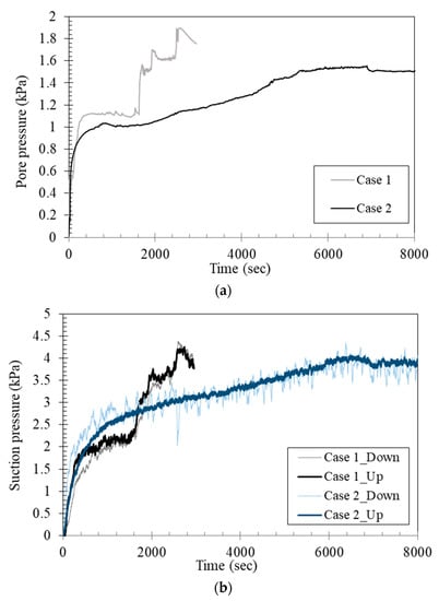 For the continuous water supply cases, the increase in pore pressure was not uniform (Figure 7a). Pikes were observed and corresponded to cavity formation and collapse throughout the test until the experiment was stopped due to the failure of the soil. The same trend was observed with the suction measurements, as shown in Figure 7b. This indicates that the ground over the initial cavity ceiling was gradually saturated, leading to a decrease in effective shear stress, which was related to a decrease in the shear strength of the cavity ceiling. With this, the saturated area over the cavity ceiling collapsed after repeated initial cavity expansion and contraction. Although the water head applied to Case 2 was higher than the water head applied to Case 1, no collapse was observed for Case 2. The soil specimen in Case 1 collapsed, while only a small settlement was observed for Case 2.