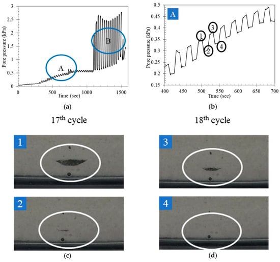 Ground subsidence process with the pore pressure for repeated water supply, Case 3: (a) Pore pressure for the Case 3 test; (b) Part A enlarged; (c) Cavity expansion and contraction of Case 3 (17th cycle, 1 and 2 in (b)); (d) Cavity expansion and contraction of Case 3 (18th cycle, 3 and 4 in (b)).
