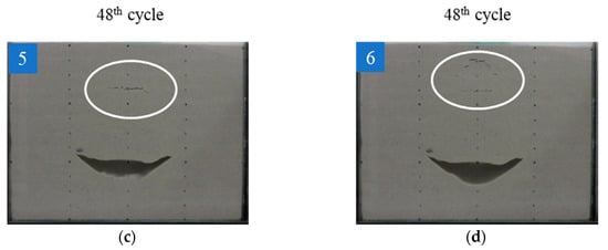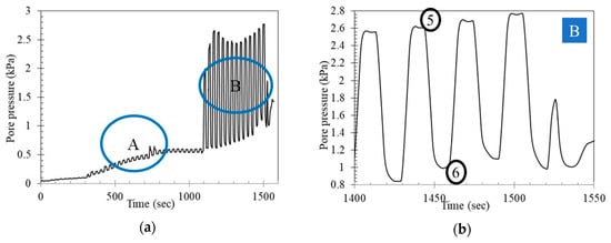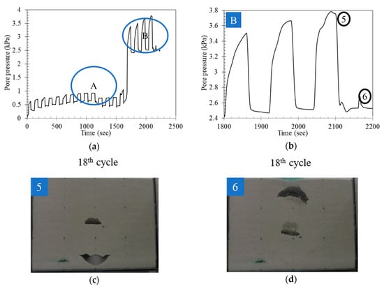 The expansion and contraction cycle was found in Case 5, as shown in Figure 10. Significant ground surface settlement occurred, and this can be seen when comparing Figure 10b, which represents the pore pressure measurements, and Figure 10c,d, which show cavity apparition and contraction following the cycles of supply and drainage. These cycles were repeated with an increase in cavity size and migration higher up in the soil specimen until final collapse. From Figure 11a displaying case 5, the last cycles circled in B area will be discussed. Figure 11b shows the last cycles before collapse, as well as the high amplitude of pore pressure values that correspond to water supply and drainage. In Figure 11c, Image 5 was taken during a period of water supply, and corresponds to an increase in pore pressure. It shows the formation of a cavity larger in size than observed during the early stages of the test. In Figure 11d, Image 6 was taken during the drainage period, and shows the contraction of the cavity and the collapse of its ceiling. This collapse was due to the loosening of the soil after each drainage.