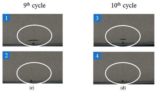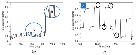 During the cyclic water supply cases, the cavity expansion and contraction process followed the water supply and drainage cycles. Whenever the water was supplied, the pore pressure on the opening increased and the cavity expanded, whereas cavity contraction and pore pressure decreased following drainage (Figure 8a). This cycle is well expressed in Figure 8b, where Part A in Figure 8a is enlarged. Part A corresponds to the early cycles and shows the increase and decrease of the pore pressure values following the supply and drainage cycles. In Figure 8c,d, the cavity contraction can be seen with the cessation of the water supply and the drainage of leaked water. After the water was supplied again in the 18th cycle, the cavity expanded again, and when the supply of water ended and pore pressure decreased, the cavity contracted again. Part B of Figure 9a corresponding to the last cycles is enlarged in Figure 9b, and represents the cavity propagation upward, preceded by the sudden increase in the groundwater level, as represented by the sudden increase in pore pressure. The higher values of pore pressure correspond to larger cavity size. During this stage, the cavity expansion and contraction cycle was repeated on a larger scale and higher in the soil specimen. As shown in Figure 9c,d, when the water supply stopped and leaked water was drained, the ground over the cavity ceiling settled downward and additional cracks occurred over the cavity, which indicated that the cavity contracted with drainage and pore pressure dropdown.