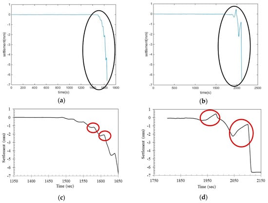 The water supply for each case applied buoyant force on the ceiling of the cavity. This was indicated by the settlement measurements. Figure 13 shows the surface settlement of Case 4 and Case 5. The black circled areas in Figure 14a,b are enlarged in Figure 14c,d, respectively, and indicate the last cycles before the total collapse of the soil specimens. As shown in the red circle in Figure 14c,d, an upwards settling was observed during each water supply, followed by an important settlement. This indicates that all the soil above the opening was affected by the water supply, and was floating, thus indicating a phenomenon of buoyancy during the cavity expansion stage.