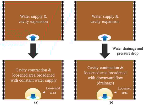 Cavity expansion and contraction cycle by water supply mode: (a) Typical cavity expansion and contraction process (continuous water supply); (b) Typical cavity expansion and contraction process (cyclic water supply).
