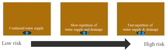 The risk level according to the water supply mode is summarized in Figure 16. The risk level was assumed according to the collapse time. Continuous leakage is less risky than the repeated leakage, as the collapse happens more slowly than with cyclic leakage. Additionally, provided that the water leakage and drainage cycle occurs without cease after each cycle as in the test cases, the faster the speed of the repetition of the cycle (or the water leakage and drainage time of each cycle), the riskier the leakage of the pipeline becomes, as shown in the collapse times in Table 3. Each cycle of supply/drainage corresponds to a cavity formation/contraction. However, the cycle of the water leakage and drainage required for the collapse increased as the water supply and drainage time decreased.