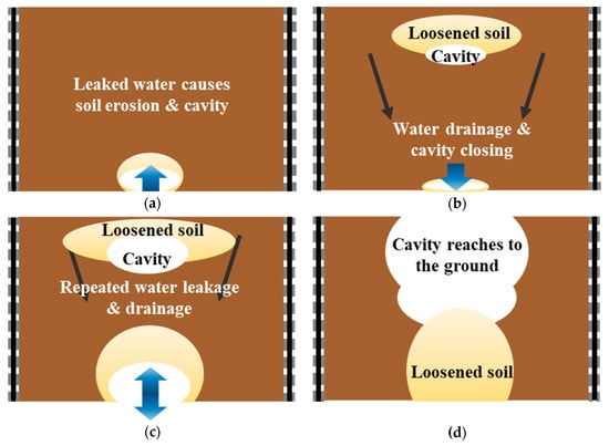 Summary of ground subsidence procedure: (a) Wter leakage and cavity formation; (b) Water drainage, closing of cavity above leakage, and loosened soil and cavity formation; (c) Repetition of water supply/drainage cycles inducing cavity expansion/contraction with an increase in cavity size and loosened soil area; (d) Final ground surface subsidence.