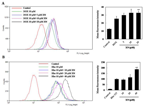 XN blocks the efflux function of ABCB1 in MCF-7/ADR cells. (A) XN affects the intracellular doxorubicin (DOX). The cells were treated with different concentrations of XN (0–40 μM) and then 10 μM DOX. The autofluorescence of DOX in MCF-7/ADR was as described in the materials and methods section. Histograms show the intracellular DOX autofluorescence, * p < 0.05, ** p < 0.01, vs. the control group; (B) Effect of XN on the efflux of the ABCB1 substrate, Rho123. After XN treatment, followed by co-incubation with Rho123, intracellular Rho123 fluorescence was detected. The relative mean fluorescence of Rho123 is shown in histograms, * p < 0.05, ** p < 0.01, vs. the control group.