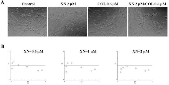 XN sensitizes the cytotoxicity of the ABCB1 substrate, colchicin (COL), in MCF-7/ADR cells. (A) MCF-7/ADR cells treated with 0.6 μM COL alone, 2 μM XN alone, or both; (B) Synergisms analyzed by median effect plot using the software, Calcusyn. MCF-7/ADR cells were co-treated with COL and XN (0.5, 1, and 2 μM) for 72 h, the proliferation inhibition was detected, and the combination index (CI) values were obtained.