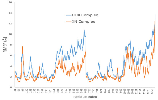 Protein Root Mean Square Fluctuation (RMSF). Protein RMSF was used to characterize local changes along the protein chain. Peaks indicate areas of the protein that fluctuated the most during the simulation. The average RMSF for the DOX complex was 4.51 Å. The average RMSF for the XN complex was 2.89 Å.